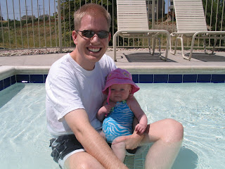 Lexi didn't know what to think at first about the swimming pool, but luckily after a few minutes decided she liked the splashing and the little water falls she could put her hands in.